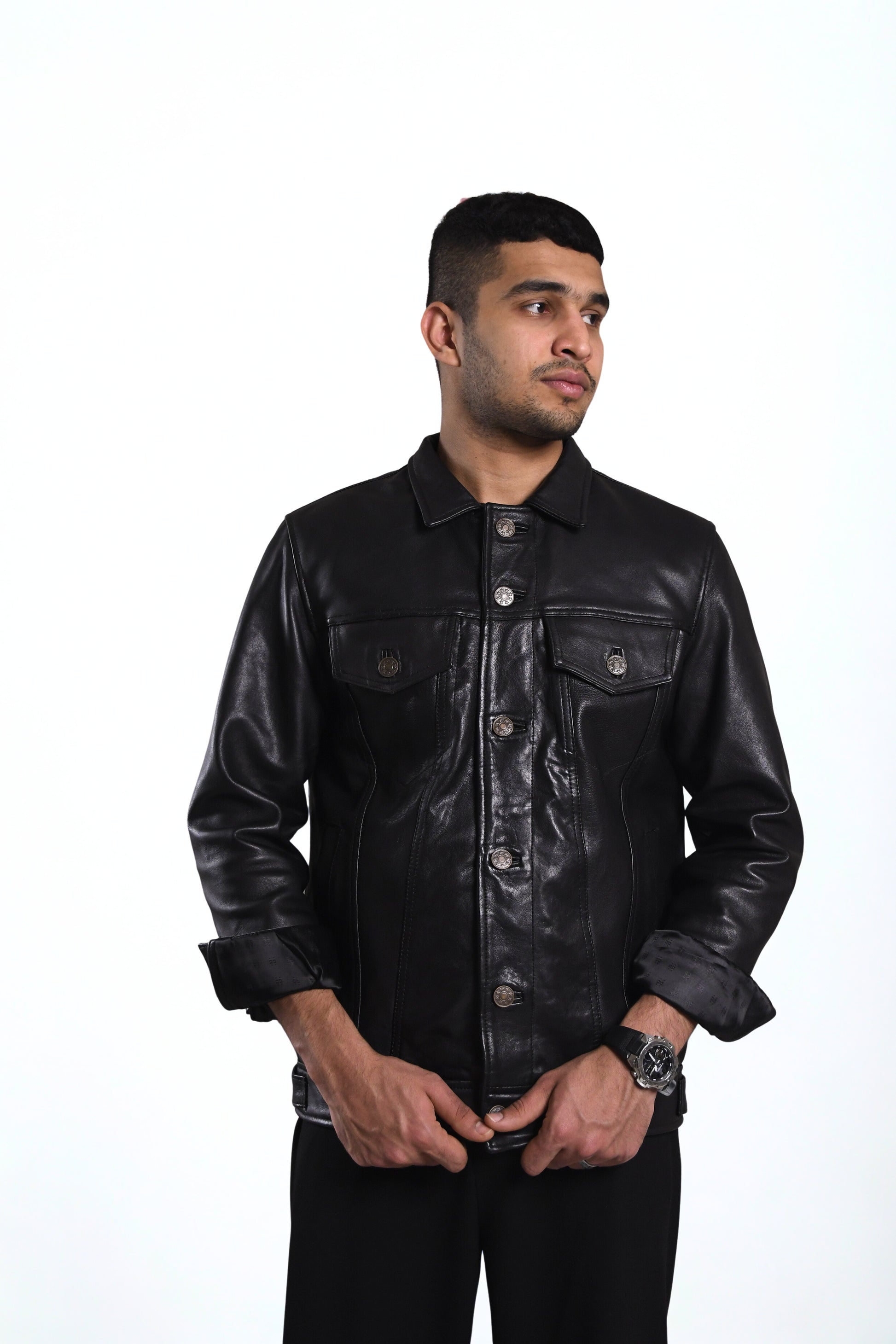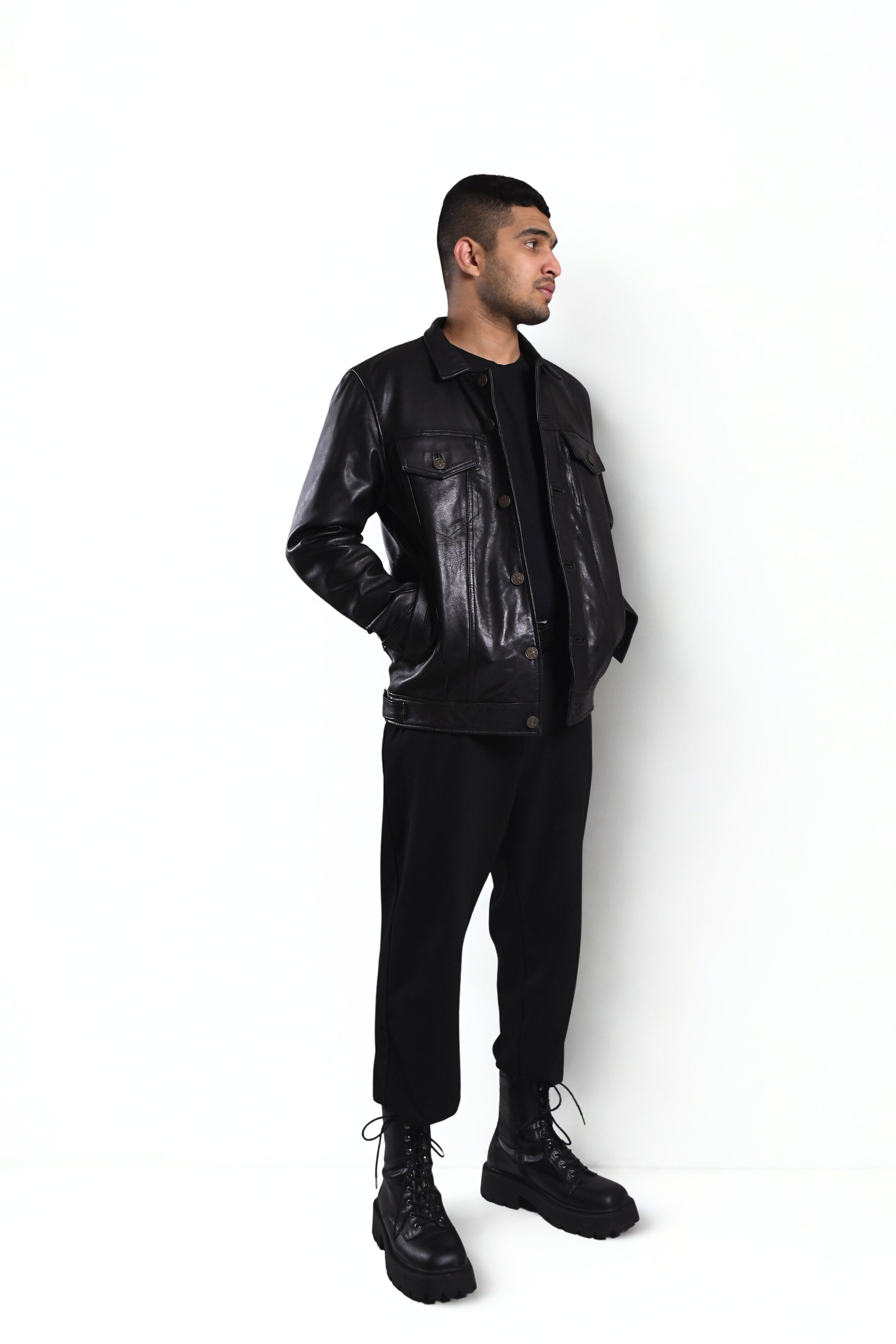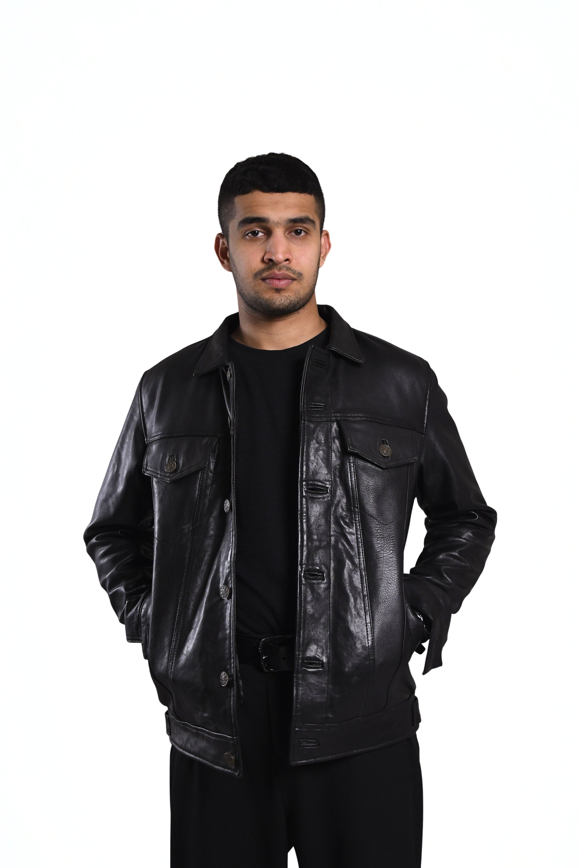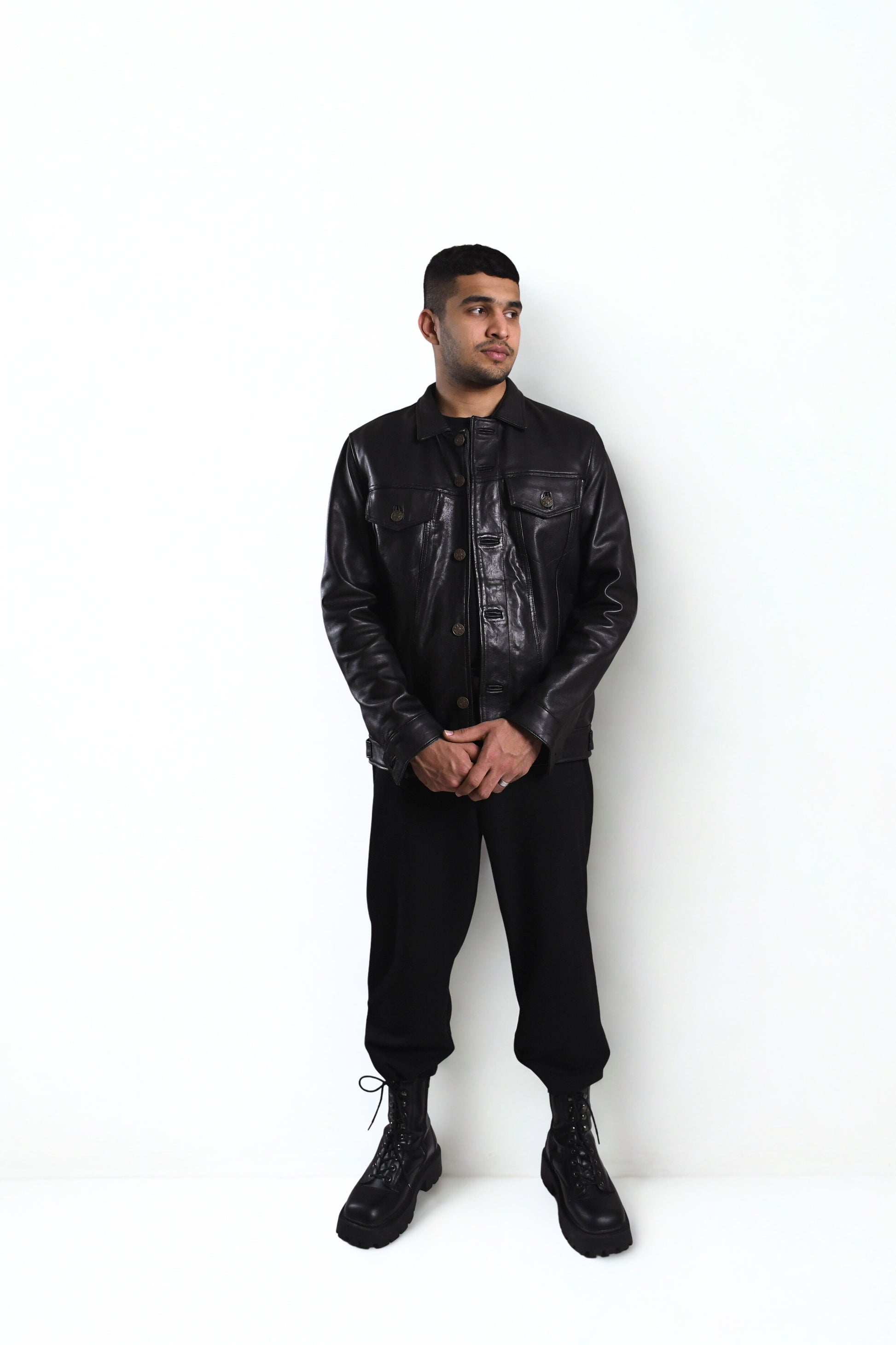 This leather trucker jacket isn’t just worn—it’s lived in. With structured lines and raw character, it reflects your drive, your edge, and the story only you can tell.