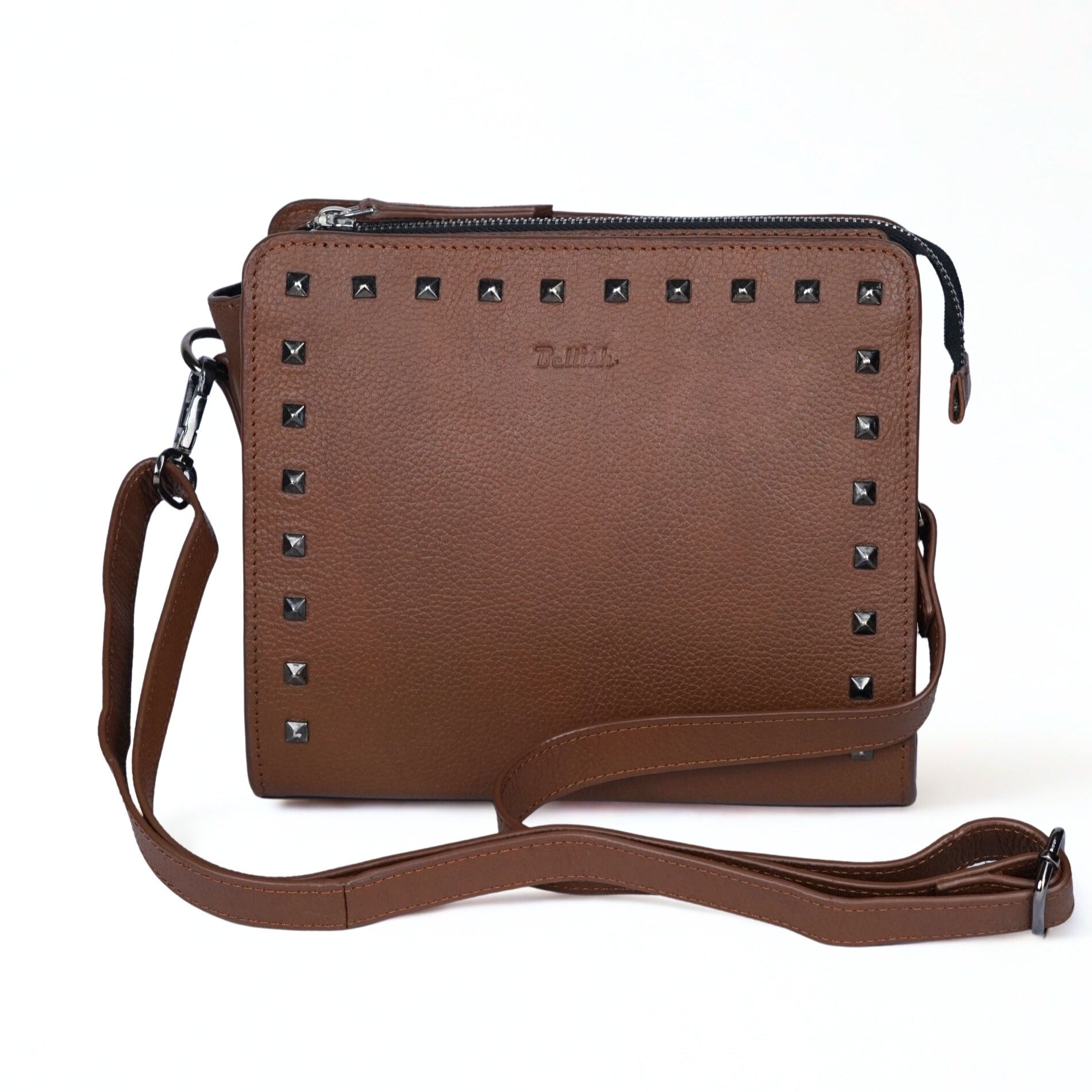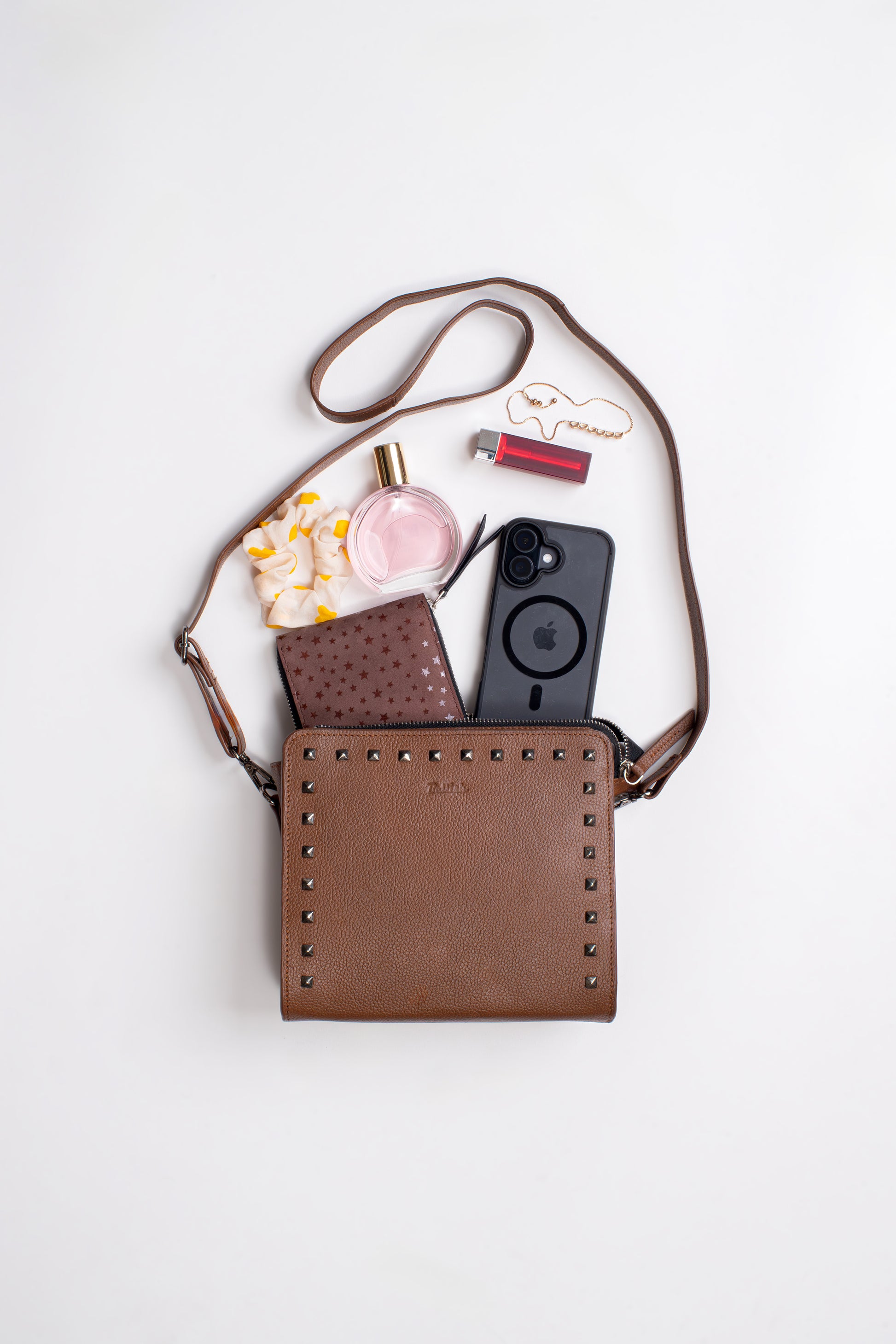 A clean silhouette punctuated with metallic studs—this leather crossbody balances edge and elegance. The zip closure and adjustable strap keep it functional. The attitude is all in the details.