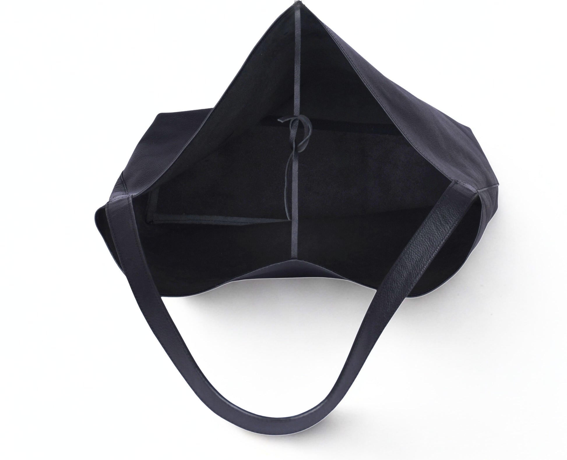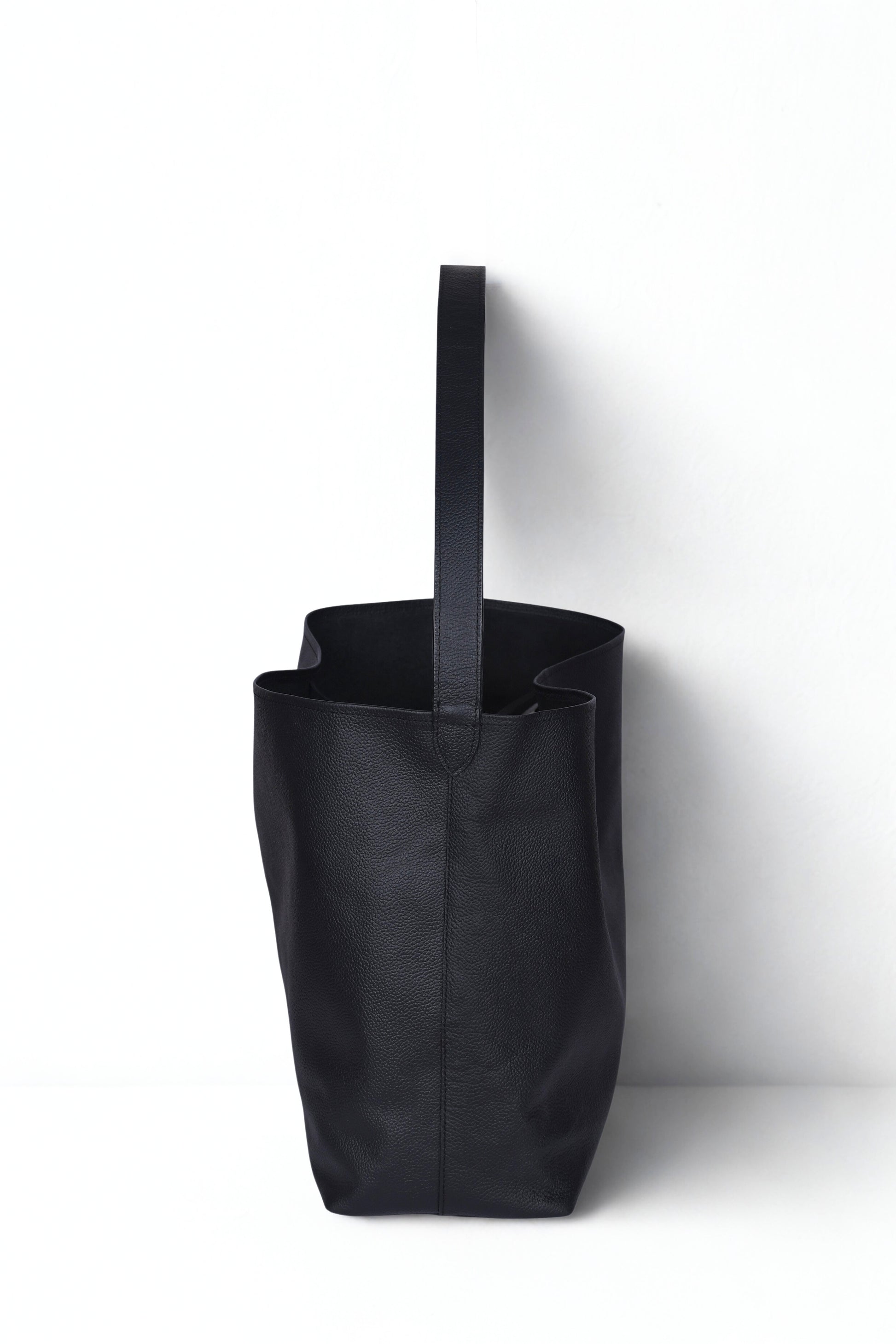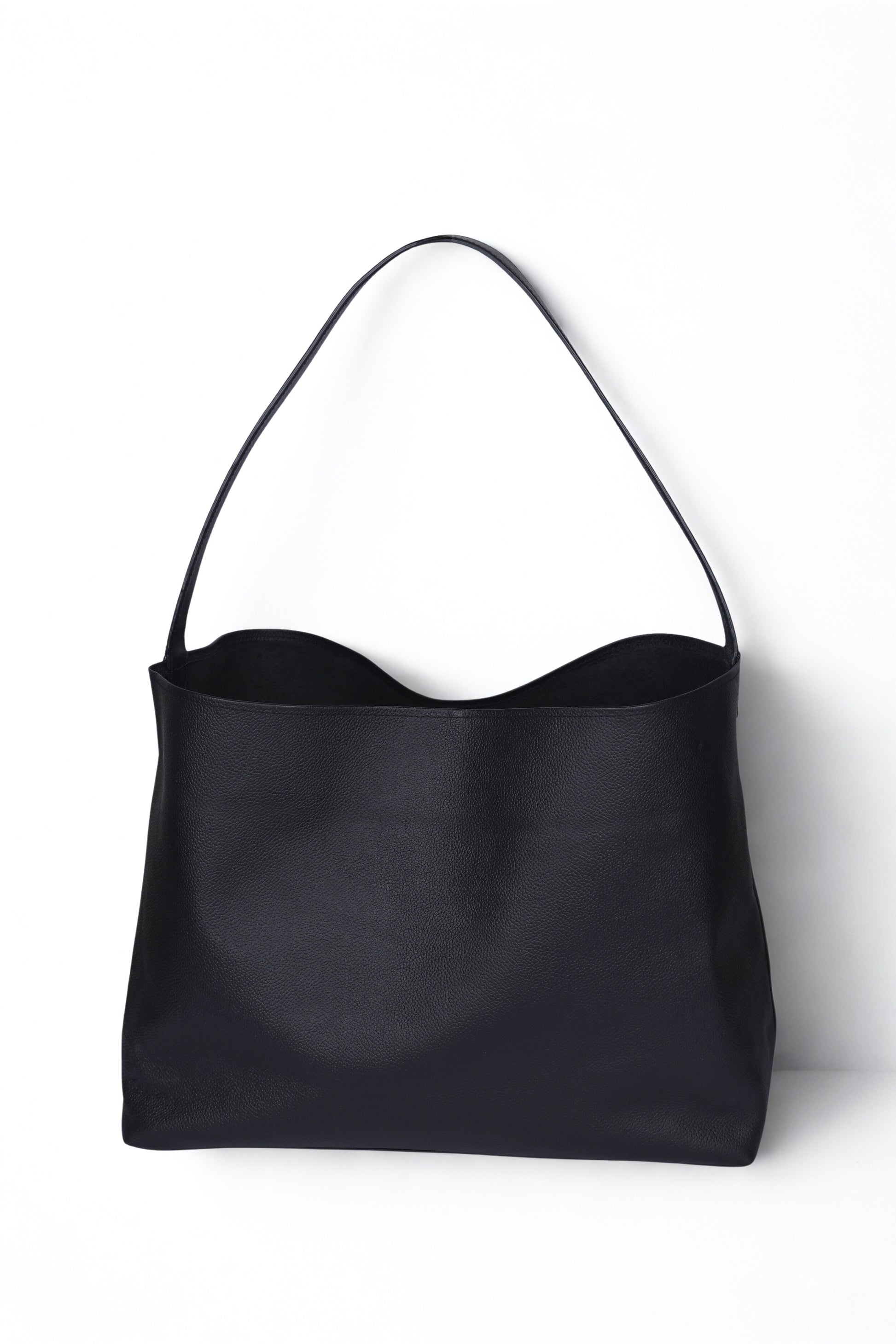 Crafted from premium black leather, this minimalist tote features a soft, slouchy silhouette with a single shoulder strap and open-top design. It combines understated luxury with effortless functionality. Perfect for work, travel, or casual refinement.