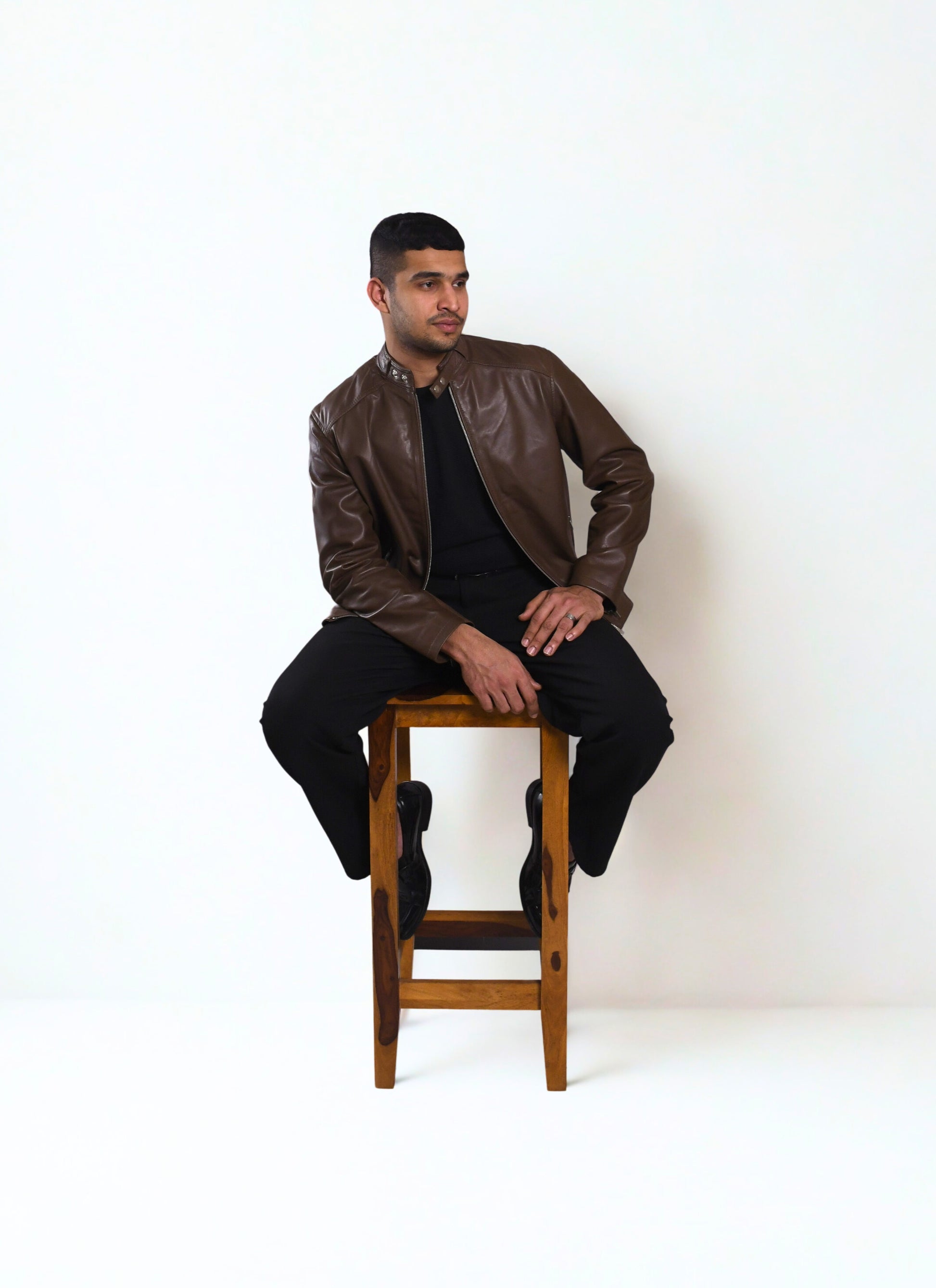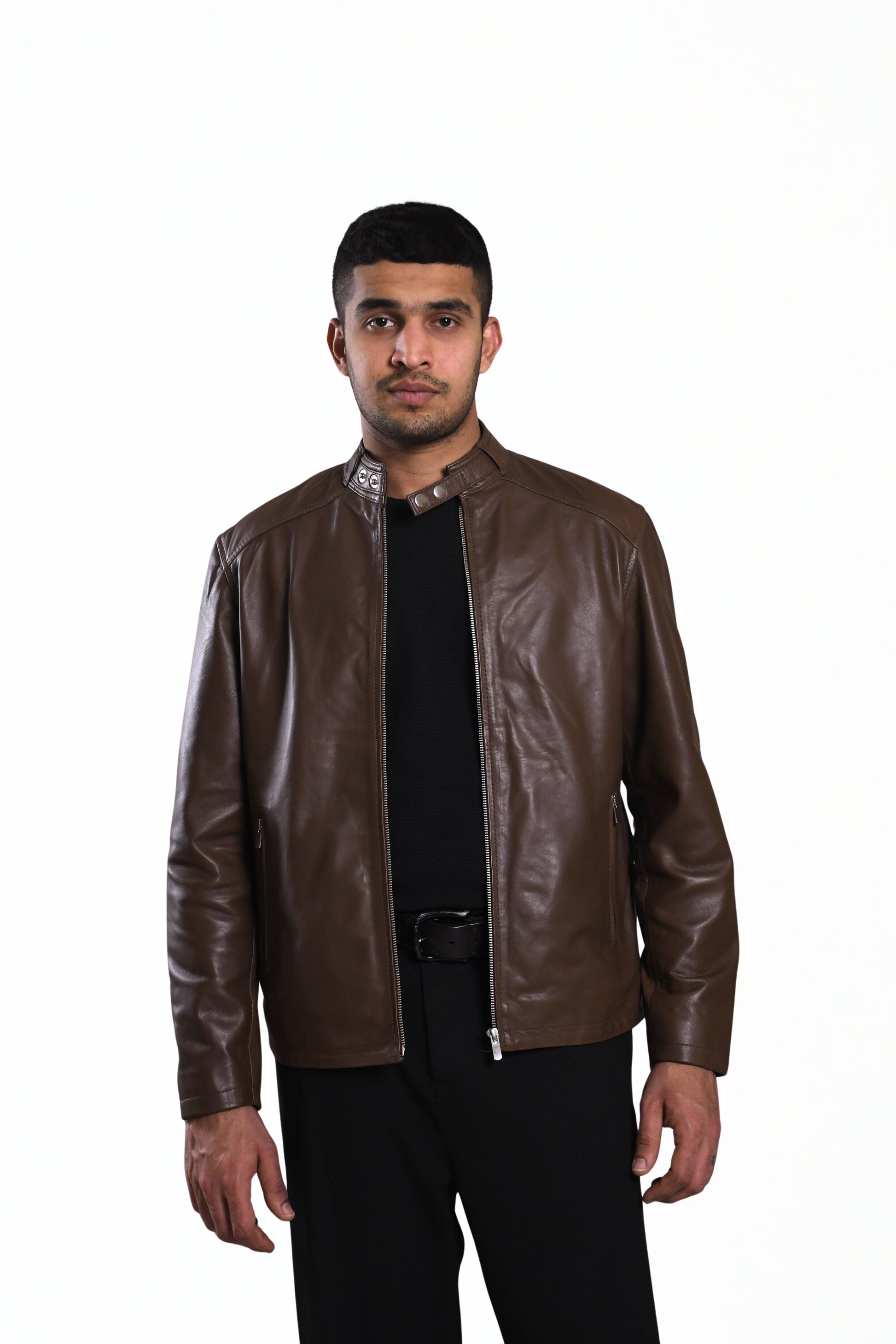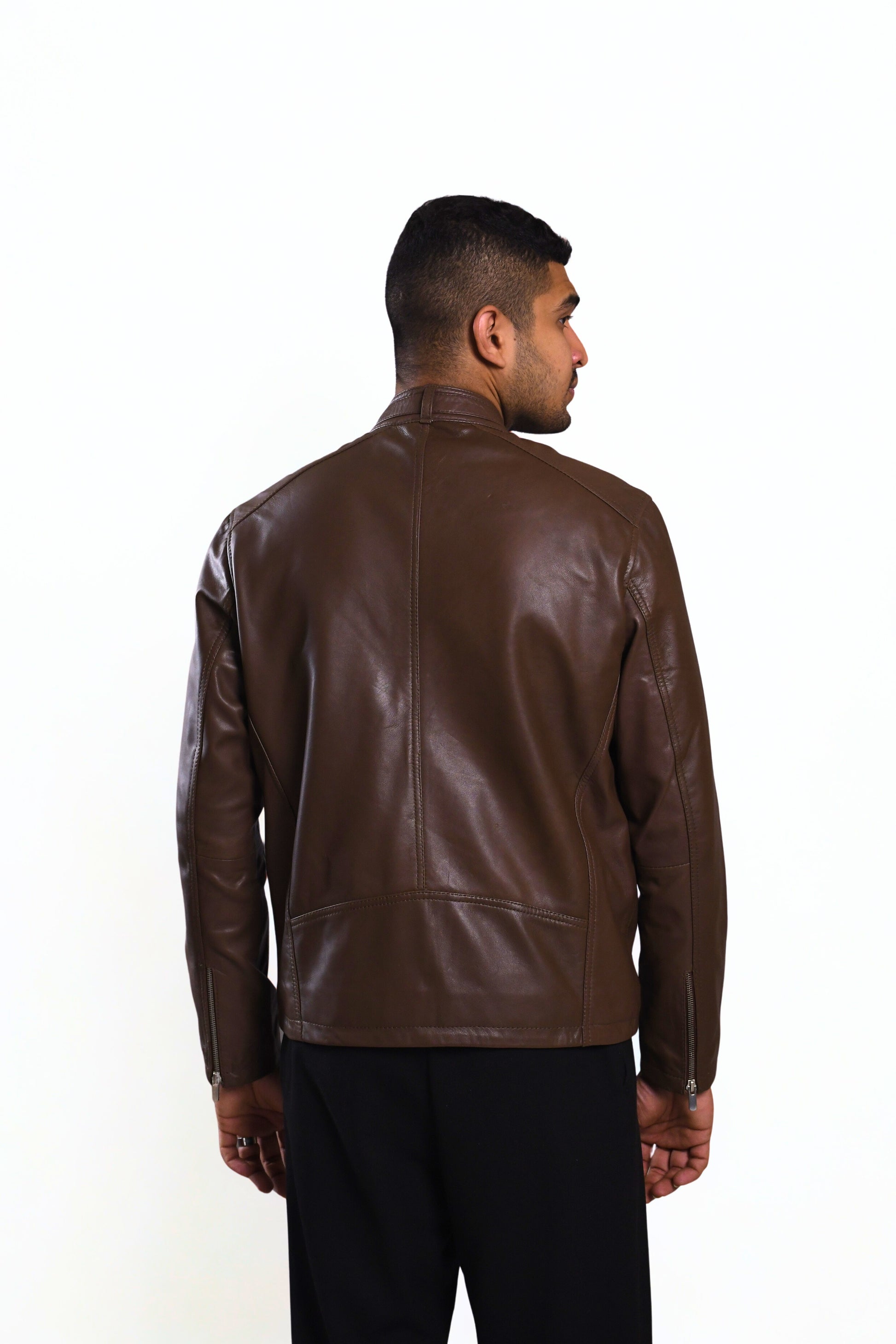 Command attention in this sleek moto leather jacket—where bold attitude meets refined craftsmanship. With striking zippers and a tailored fit, it’s your go-to for instant edge and everyday cool